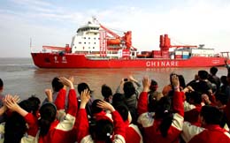 11月12日,送別考察隊(duì)的人群在碼頭上與“雪龍”號(hào)南極考察船揮手道別。 當(dāng)日,中國第24次南極科學(xué)考察隊(duì)從中國極地考察國內(nèi)基地碼頭啟程,乘坐改裝一新的“雪龍”號(hào)極地科學(xué)考察船,奔赴南極,執(zhí)行中國2007至2008年度科學(xué)考察和后勤保障任務(wù)。 |