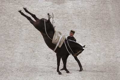 20日,在法國的巴黎貝爾西綜合體育館,一名騎手在訓練他的愛騎表演動作。由歐洲4個馬術學院首次共同舉行的馬術表演將于11月23日開幕,為期3天。