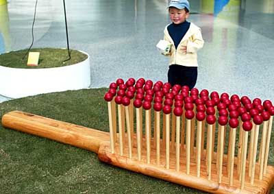 11月21日,一個小朋友在展覽上觀看木制的大毛刷。