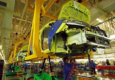 11月27日,長(zhǎng)安汽車集團(tuán)在2007年長(zhǎng)安汽車海外商務(wù)大會(huì)上向媒體透露,長(zhǎng)安汽車整車出口呈現(xiàn)高速增長(zhǎng)態(tài)勢(shì),預(yù)計(jì)2007年汽車整車出口量將首次突破4萬輛。圖為工人在長(zhǎng)安奔奔轎車生產(chǎn)線上工作(資料照片)。 | |