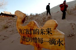 11月29日,幾名游客從月牙泉旁矗立的節(jié)水宣傳牌旁走過。 近日,為有效遏制敦煌生態(tài)環(huán)境惡化勢頭,保護(hù)月牙泉、鳴沙山這一沙泉相伴的自然奇觀,甘肅省啟動月牙泉景區(qū)治理工程。該工程計劃投資7081萬元,通過月牙泉水位下降應(yīng)急治理工程和鳴沙山山體保護(hù)工程,治理流沙對月牙泉的侵害,對其周圍區(qū)域生態(tài)環(huán)境進(jìn)行保護(hù)。 |