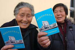 12月12日,山東無棣埕口鎮(zhèn)后埕村村民吳桂華(左)和吳秀芝領到了《新型農(nóng)村合作醫(yī)療證》。 當日,山東省2008年度新型農(nóng)村合作醫(yī)療開始登記。山東省2007年進一步新增新型農(nóng)村合作醫(yī)療試點縣(市、區(qū)),全省134個有農(nóng)業(yè)人口的縣已全部建立新型農(nóng)村合作醫(yī)療制度。 |