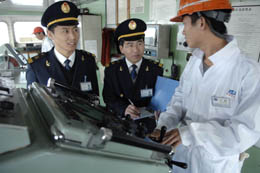 12月18日,黃驊海事局兩名工作人員在一艘輪船上向船員征求航道的有關(guān)改進(jìn)意見。近年來,河北省黃驊海事局針對黃驊港航道狹長特殊的復(fù)雜環(huán)境和易引起船舶擱淺事故的實際情況,主動與港口及港航企業(yè)、地方政府、船舶代理部門、公安邊防和航標(biāo)部門等單位溝通聯(lián)系,通過建立相互之間平等訴求、溝通、協(xié)商機(jī)制和發(fā)生海上交通、污染事故緊急會商制度、聯(lián)合執(zhí)法制度,各項安全生產(chǎn)指標(biāo)均得到有力保證。 |