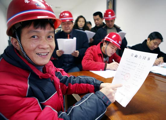 12月25日,農(nóng)民工與用工單位簽訂勞動(dòng)合同書(shū)。當(dāng)日,四川華鎣星星建設(shè)集團(tuán)按照2008年1月1日正式實(shí)施的《勞動(dòng)合同法》有關(guān)規(guī)定,與在集團(tuán)務(wù)工的1300多名農(nóng)民工分別簽訂了勞動(dòng)合同書(shū)。據(jù)悉,截至當(dāng)日,華鎣市已有2.8萬(wàn)名農(nóng)民工按照《勞動(dòng)合同法》的規(guī)定與用工單位正式簽訂了2008年度的勞動(dòng)用工合同。 | |