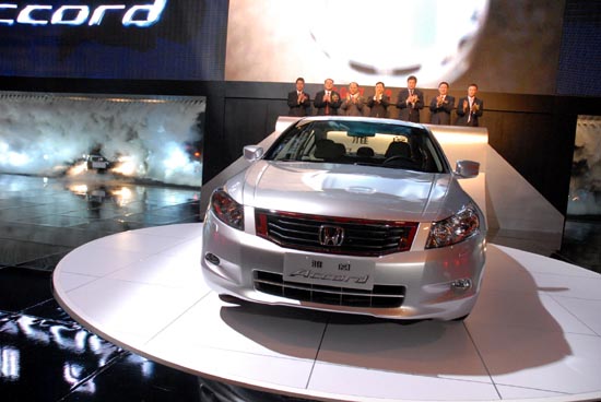 廣州本田的第八代雅閣車下線儀式現(xiàn)場(chǎng)(12月27日攝)。當(dāng)日,廣州本田汽車有限公司的新車型——第八代雅閣車下線。此款新車將于2008年初在全國(guó)上市,年產(chǎn)銷計(jì)劃為17.8萬輛,上市時(shí)將公布售價(jià)。