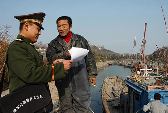 12月24日,蓬萊市海港邊防派出所民警在蓬萊閣景區(qū)內(nèi)向靠港避風的漁民進行法制宣傳教育。