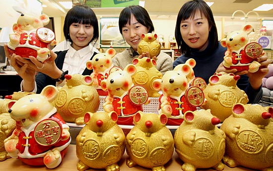 2008年1月1日,在韓國首都首爾的一家商場(chǎng),售貨員展示老鼠造型的存錢罐。2008年是農(nóng)歷鼠年,韓國商家借機(jī)推出了各種老鼠造型的用品。