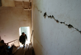 江西省上饒縣商貿(mào)大市場2002年建成后交付使用。但300多戶居民入住僅數(shù)月,就發(fā)現(xiàn)房屋出現(xiàn)嚴(yán)重質(zhì)量問題。經(jīng)江西省贛坤建筑工程司法鑒定所鑒定,這個(gè)市場屬于必須整改的嚴(yán)重危房。上饒縣有關(guān)部門2004年責(zé)成有關(guān)開發(fā)商限期進(jìn)行整改,但時(shí)至今日,由于開發(fā)商多次逃避和推卸責(zé)任,相關(guān)部門沒有及時(shí)督促,市場仍未進(jìn)行整改,300多戶居民在危房中心驚膽戰(zhàn)地度過了六年。圖為業(yè)主周田賓的商品房主梁已出現(xiàn)大裂縫。 |