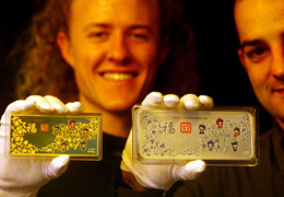 北京2008年奧運會五福賀歲金、銀條將于1月8日在北京上市銷售!拔甯YR歲金、銀條”由北京奧組委授權(quán)、中國印鈔造幣總公司制造發(fā)行、中鈔國鼎投資有限公司總經(jīng)銷!拔甯YR歲金條”規(guī)格分別為50克、100克、500克和1000克四種;“五福賀歲銀條”規(guī)格分別為50克、100克和1000克三種。