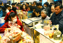 上海市農(nóng)委近日發(fā)布的消息顯示,上海年貨市場日趨龐大,單以農(nóng)產(chǎn)品為例,上海目前年均農(nóng)產(chǎn)品交易總額已達(dá)900億元左右,其中歲末年初的年貨市場規(guī)?蛇_(dá)100億元。