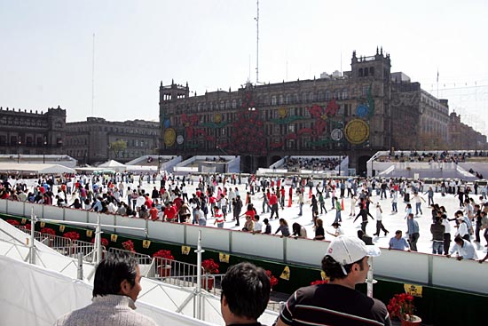 8日,墨西哥首都墨西哥城的人工溜冰場人頭攢動。墨西哥城全年氣候溫和,通常不結冰。墨西哥城市政府于2007年年末在該市憲法廣場建起一個3000平方米的人工溜冰場供市民消遣。自去年12月1日正式啟用以來,這個溜冰場接待市民近30萬人次。