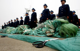 1月10日,農(nóng)業(yè)部東海區(qū)漁政漁港監(jiān)督管理局執(zhí)法人員在非法流網(wǎng)銷毀儀式上。當日,北太平洋公海非法流網(wǎng)漁具銷毀儀式在中國漁政東海總隊碼頭舉行。據(jù)了解,使用非法流網(wǎng)捕魚將嚴重損害海洋生物資源,影響航行安全,侵害合法漁民的利益。