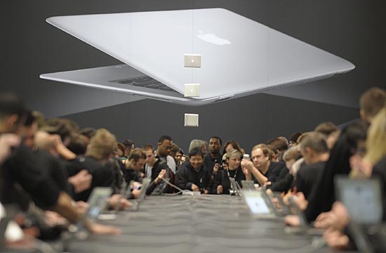 15日,在美國加利福尼亞州的舊金山,一些參觀者試用美國蘋果公司新推出的筆記本電腦。在當(dāng)天開幕的2008年MacWorld大會(huì)上,蘋果公司推出了這款支持觸摸屏的13.3英寸寬屏輕薄筆記本電腦Macbook Air,其厚度約為19.4毫米,重量約為1.36千克。