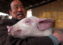 1月17日,在甘肅省天水市麥積區(qū)甘泉鎮(zhèn)的一處養(yǎng)殖基地內(nèi),農(nóng)民阮清平正抱著繁育的良種豬仔。 針對肉蛋奶等農(nóng)產(chǎn)品價(jià)格大幅上漲的情況,今年甘肅將重點(diǎn)扶持新建標(biāo)準(zhǔn)化養(yǎng)殖小區(qū)500個(gè),擴(kuò)大養(yǎng)殖規(guī)模,增加出欄量和市場供應(yīng),突出加強(qiáng)生豬良種繁育體系和標(biāo)準(zhǔn)化規(guī)模養(yǎng)殖場建設(shè),力爭豬肉產(chǎn)量達(dá)到70萬噸,肉蛋奶產(chǎn)量達(dá)到170萬噸,增長9.7%。