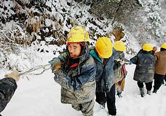 耐張段的塔位均在山頂、山脊或山梁上,周圍地形十分陡峭,道路狹窄難行,有的地方甚至要“攀著樹枝上下”。 目前現(xiàn)場(chǎng)積雪厚達(dá)30多厘米,許多地方踩下去到人的膝蓋。葉義德介紹說,為解決山區(qū)道路的運(yùn)輸問題,搶險(xiǎn)指揮部安排人力鏟除到塔位道路的積雪,還緊急聯(lián)系了馬幫,調(diào)運(yùn)了20匹馬到達(dá)現(xiàn)場(chǎng)。 此次搶險(xiǎn)的物資共有130多噸,有很多物資的單件重量超過500公斤。余偉告訴記者說,“在險(xiǎn)峻的山路上運(yùn)輸,只能靠肩扛手拉、馬背人拽!
