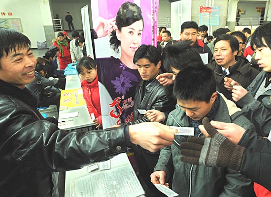 2月12日,一家義烏針織企業(yè)的招工者(左一)在向應(yīng)聘民工們分發(fā)介紹企業(yè)的名片。