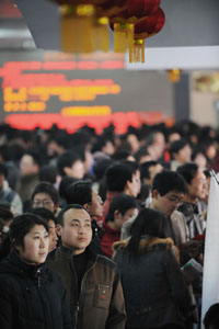 2月14日,應(yīng)聘者在閱讀招聘信息。 當(dāng)日,“2008年山西省春季大型人才招聘暨大中專畢業(yè)生就業(yè)洽談會”正式開幕。本次人才交流大會為期兩天,前來參加招聘會的用人單位包括上市公司、國有大中型企業(yè)、民營企業(yè)、高新技術(shù)企業(yè)以及大中專院校、科研院所等共300余家,提供約8000多個工作崗位。據(jù)了解,約有包括應(yīng)往屆大中專畢業(yè)生在內(nèi)的各類社會求職者1萬2千人前來應(yīng)聘。另外,根據(jù)人事部等部門的相應(yīng)要求,山西人才市場對所有應(yīng)聘者一律免收入場費(fèi),求職者信息免費(fèi)登記并錄入人才信息庫。 |