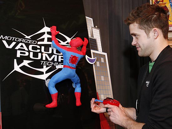 17日,在美國紐約舉行的美國國際玩具展上,一名工作人員展示遙控蜘蛛俠玩具的功能。這款玩具能在墻上爬上爬下,并將于秋季上市。新華社/路透
