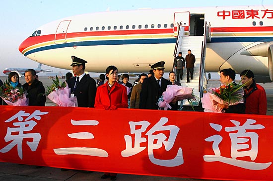 2月19日,中國東方航空公司的一架空客A340大型客機在上海浦東國際機場第三跑道試飛成功。據(jù)悉,第三跑道為4F等級,可起降未來全球最大的客機A380。這條跑道計劃于2008年3月13日正式投入使用,將大大提高浦東機場運量保障能力,也標(biāo)志上海成為全國首個擁有4條機場跑道的城市。