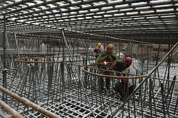 經過建設者十余年的艱苦奮戰(zhàn),目前三峽工程建設已進入最后沖刺階段,升船機續(xù)建、地下電站等項目正在加緊建設中。三峽工程初步設計中的26臺70萬千瓦機組,將于2008年底全部安裝完成投入運行,比原計劃提前一年。圖為葛洲壩集團公司職工在三峽工程升船機底板部位安裝鋼筋網(wǎng),以便進行混凝土澆筑。