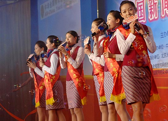 2月27日,南航空姐在演唱選拔賽主題曲。當(dāng)天,中國南方航空公司招聘空姐新聞發(fā)布會在京舉行。據(jù)悉,本次招聘工作將從3月開始,預(yù)計于今年8月結(jié)束。新華社發(fā)