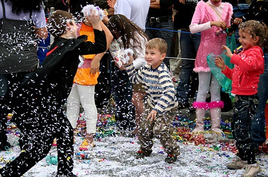 9日,在塞浦路斯南部城市利馬索爾舉行的狂歡節(jié)閉幕游行上,幾名兒童相互拋灑紙屑。2月28日開(kāi)幕的利馬索爾狂歡節(jié)當(dāng)晚落下帷幕。