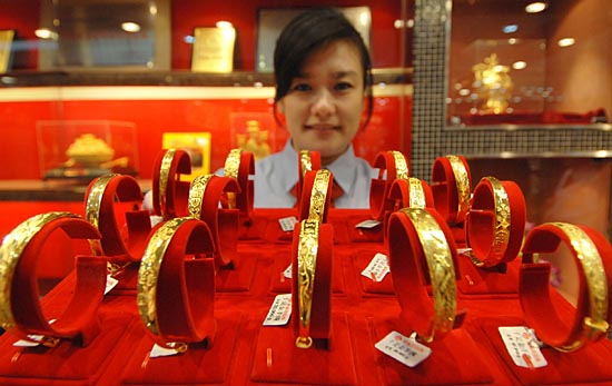 3月11日,沈陽(yáng)某商場(chǎng)的工作人員在整理黃金飾品。從3月10日起,沈陽(yáng)黃金足金價(jià)格達(dá)到260元/克,每克上調(diào)7元;千足金達(dá)到270元/克,每克上調(diào)7元,這是2008年沈陽(yáng)黃金價(jià)格第3次上調(diào)。