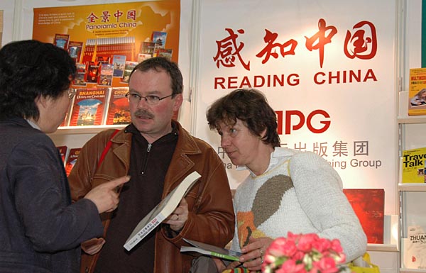 15日,中國國際出版集團工作人員(左)在德國萊比錫書展上向參觀者介紹中國圖書。2008年萊比錫書展于3月13日至16日舉行。