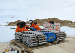 這是我國第24次南極科考隊員在進行冰雪面移動機器人的現(xiàn)場實驗準(zhǔn)備工作(2007年12月22日攝)。冰雪面移動機器人可自主跨越冰裂縫、翻越雪坡和雪丘,自重300公斤,最大作業(yè)半徑為25公里,可搭載40公斤的重量,拖曳100公斤的重量。