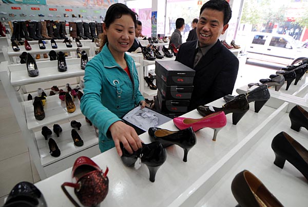 3月19日,羅紅星(右)、祝伏金夫婦在鞋城將新產(chǎn)品上架。2007年2月,雙雙下崗在家的羅紅星、祝伏金夫婦用政府發(fā)放的5萬(wàn)元小額擔(dān)保貸款開(kāi)辦了百姓鞋城,誠(chéng)信經(jīng)營(yíng),還安置了4名下崗工人再就業(yè)。 江西省自2002年底在全國(guó)率先啟動(dòng)小額貸款工作以來(lái),小額貸款在促進(jìn)全民創(chuàng)業(yè)、加快全省經(jīng)濟(jì)發(fā)展和改善就業(yè)環(huán)境等方面發(fā)揮了越來(lái)越重要的作用。截至2007年底,江西省累計(jì)發(fā)放小額擔(dān)保貸款42.53億元,直接扶持個(gè)人創(chuàng)業(yè)9.68萬(wàn)人,帶動(dòng)就業(yè)28.84萬(wàn)人,還貸率高達(dá)97.5%。 | |