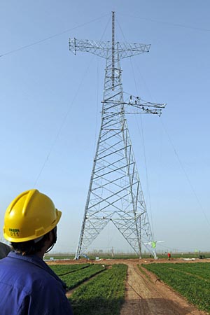 3月23日,在河南省沁陽(yáng)市境內(nèi),晉東南—南陽(yáng)—荊門特高壓交流試驗(yàn)示范工程第五標(biāo)段施工人員組立一座耐張轉(zhuǎn)角塔。由國(guó)家電網(wǎng)公司建設(shè)的我國(guó)第一條百萬(wàn)伏級(jí)輸電線路——晉東南—南陽(yáng)—荊門特高壓交流試驗(yàn)示范工程目前進(jìn)展順利,全線鐵塔組立工作接近尾聲。該工程起于山西長(zhǎng)治,經(jīng)河南南陽(yáng),至湖北荊門,跨越黃河、漢江兩大河流,工程靜態(tài)總投資約56.88億元,系統(tǒng)額定電壓1000千伏。 | |