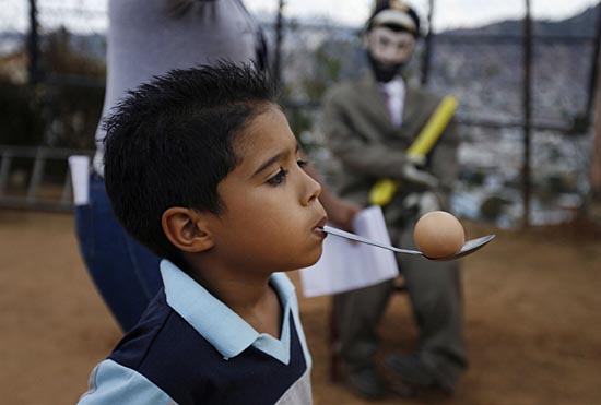 23日,在委內(nèi)瑞拉首都加拉加斯舉行的慶祝復(fù)活節(jié)的趣味比賽中,一名男孩用嘴叼著勺子運(yùn)送雞蛋。加拉加斯當(dāng)天舉行各種趣味比賽慶祝復(fù)活節(jié)。新華社/路透