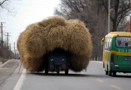 3月26日,一輛滿載麥草的農(nóng)用機(jī)動(dòng)車在公路上與一輛長(zhǎng)途客車相向而行。 在甘肅省境內(nèi)省道309線康家崖至臨夏公路上,經(jīng)常行駛著裝滿麥草的農(nóng)用機(jī)動(dòng)車。這些滿滿當(dāng)當(dāng)?shù)霓r(nóng)用車行駛在公路上,活像一個(gè)個(gè)移動(dòng)的巨大草垛,其交通安全實(shí)在令人擔(dān)憂。