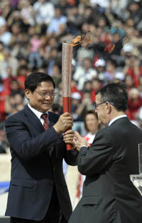 3月30日,中共中央政治局委員、北京市委書記、北京奧組委主席劉淇(左)在雅典1896年首屆現(xiàn)代奧運(yùn)會(huì)主會(huì)場(chǎng)從希臘奧委會(huì)主席基里亞庫手中接過北京奧運(yùn)會(huì)圣火火炬。當(dāng)日,北京奧運(yùn)會(huì)圣火交接儀式在雅典1896年首屆現(xiàn)代奧運(yùn)會(huì)會(huì)場(chǎng)舉行。 |