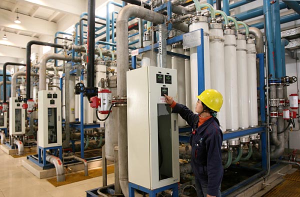 近年來,中國華電集團公司堅持科學(xué)發(fā)展觀,積極發(fā)展循環(huán)經(jīng)濟,推進資源、廢物綜合利用和再生資源、水資源的循環(huán)利用,圍繞環(huán)保、節(jié)能、高效,開發(fā)應(yīng)用新技術(shù)、新工藝、新裝備,促進生產(chǎn)運營、基本建設(shè)及電站裝備領(lǐng)域的科技創(chuàng)新和技術(shù)升級。圖為華電新鄉(xiāng)發(fā)電有限公司一名技術(shù)人員在調(diào)節(jié)濾水裝置。 | |