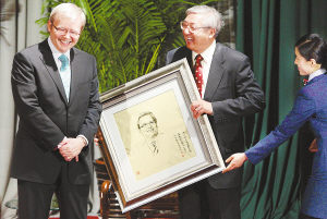 4月9日,澳大利亞總理陸克文在北京大學(xué)用中文發(fā)表演講,并回答了北大學(xué)生的提問。演講后,北京大學(xué)校長許智宏向陸克文贈送了北大教師為他作的畫像。趙青