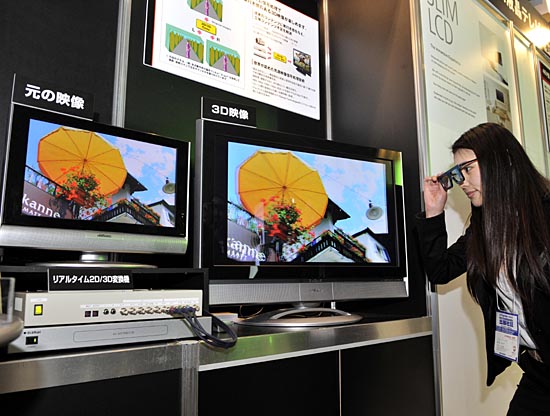 16日,在日本首都東京舉行的日本平板顯示器展上,一名JVC公司的職員展示該公司的實時3D立體影像轉(zhuǎn)換系統(tǒng)。畫面左側(cè)為原始圖像,右側(cè)是經(jīng)過轉(zhuǎn)換后的3D立體影像,使用者只需戴上特殊眼鏡便能實時看到逼真的立體影像。新華社/法新