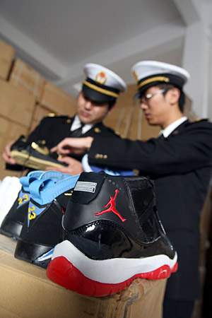 寧波海關(guān)日前對(duì)被控的四個(gè)集裝箱同時(shí)進(jìn)行突擊查驗(yàn),一舉查獲假冒“NIKE”和“飛人喬丹JORDAN(圖形)”商標(biāo)運(yùn)動(dòng)鞋四個(gè)整柜,共計(jì)39360雙,按照正品價(jià)格計(jì)算,貨值約3000萬元人民幣。