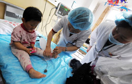 5月7日,兩位醫(yī)生在阜陽(yáng)市人民醫(yī)院為一名住院患兒檢查身體。記者5月7日從安徽省衛(wèi)生廳了解到,到5月5日24時(shí),阜陽(yáng)腸道病毒感染病例新增433例,病例總數(shù)已達(dá)4929例,死亡人數(shù)連續(xù)5天未上升。到5月5日24時(shí),安徽全省17個(gè)市均有散在病例報(bào)告,全省共報(bào)告6545例。至今安徽全省已經(jīng)治愈3166例,其中危重患者104例。 |