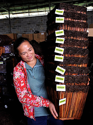 5月7日,廣西河池市都安縣一藤編編織廠女工在搬裝外銷的藤編工藝品。