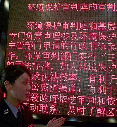 江蘇省無錫市法院6日成立專門的環(huán)境保護審判法庭,以加強對太湖等地環(huán)境生態(tài)的司法保護力度。這也是江蘇首個分別在兩級法院設(shè)立專門的審判庭與合議庭的環(huán)保法庭,建成后除了進行環(huán)保審判工作外,還將積極探索環(huán)境公益訴訟。 據(jù)介紹,近3年,無錫市兩級法院共受理各類涉及環(huán)保的訴訟案件18件,涉及環(huán)保的行政非訴審查案件273件,特別是去年太湖出現(xiàn)水生態(tài)危機以來,環(huán)保糾紛有所增加,環(huán)境犯罪沒有被依法追究責任、環(huán)境受害者的合法權(quán)益得不到有效保護的情況依然存在。 據(jù)無錫市中級人民法院院長褚紅軍介紹,設(shè)立專門的環(huán)境保護審判機構(gòu),實現(xiàn)專業(yè)化審判,將充分整合現(xiàn)有的司法資源,實行刑事、民事、行政“三合一”的全新審判模式,統(tǒng)一環(huán)境訴訟案件的司法標準。根據(jù)職能劃分,無錫環(huán)保法庭將依法審判涉及轄區(qū)內(nèi)水土、山林保護的排污侵權(quán)、損害賠償?shù)纫、二審案件,負責對有關(guān)部門和企業(yè)提出環(huán)境保護方面的司法整改建議,并做好相關(guān)的法制宣傳工作。 無錫市中級人民法院一名法警在介紹環(huán)保法庭的有關(guān)情況。新華社記者