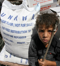 5月5日,一名巴勒斯坦兒童在從聯(lián)合國近東巴勒斯坦難民救濟和工程處在加沙地區(qū)的總部領(lǐng)取救濟糧后坐上驢車離開。該組織在加沙地區(qū)的發(fā)言人當(dāng)天說,由于燃料短缺,該組織將于當(dāng)天開始再次停止對加沙地帶的食品援助。