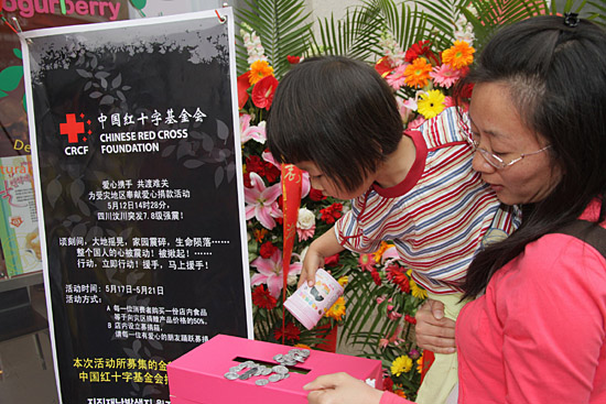 5月17日,韓國(guó)姚格貝麗餐飲有限公司同中國(guó)紅十字基金會(huì)合作,呼吁在北京工作、學(xué)習(xí)和經(jīng)商的部分韓國(guó)人設(shè)立“愛心角”,向?yàn)?zāi)區(qū)人民獻(xiàn)愛心。姚格貝麗餐飲有限公司將把5月17日—5月21日其間的銷售額的50%通過中國(guó)紅十字基金會(huì)捐給四川地震災(zāi)區(qū)。 | |