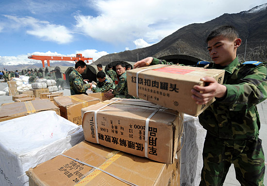 5月18日,解放軍戰(zhàn)士在拉薩搬運(yùn)救災(zāi)物資。當(dāng)日,西藏20多個(gè)單位向四川地震災(zāi)區(qū)捐贈(zèng)藏藥、食品、礦泉水等價(jià)值1100多萬(wàn)元的物資。