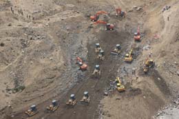 28日,大型機械在唐家山堰塞湖搶險現(xiàn)場進行泄流槽施工。