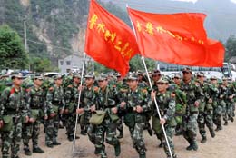 28日,武警水電二總隊抗震救災(zāi)突擊隊抵達北川,增援唐家山堰塞湖搶險工作。
