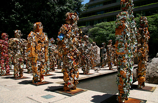 2日,在美國首都華盛頓,由德國雕塑家舒爾特創(chuàng)作的“垃圾人”在美國國家地理學會的院子里展出。創(chuàng)作這些“垃圾人”的原材料是在德國城市科隆的市政垃圾處理場里收集來的。舒爾特進行此次創(chuàng)作的目的是促使人們提高環(huán)保意識。新華社/法新