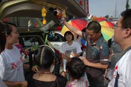 5月31日,人們在臺州的“汽車后備箱市場”選購物品。當(dāng)日,浙江臺州的200多輛私家車聚集在當(dāng)?shù)匾惶帍V場參加“汽車后備箱市場”活動(dòng)。車主們以后備箱為“攤位”,擺放汽車配飾、生活用品等供人選購。全部義賣所得和其他募集的善款將捐獻(xiàn)地震災(zāi)區(qū),用于援建一所愛心學(xué)校。