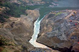 9日17時,從空中看到的堰塞湖泄洪渠水流越來越急。當日,參加唐家山堰塞湖搶險工作的解放軍、武警水電部隊官兵使用爆破、機械作業(yè)等手段對唐家山堰塞湖繼續(xù)泄洪。截至記者發(fā)稿時止,唐家山堰塞湖泄洪流量已達80.8立方米/秒。