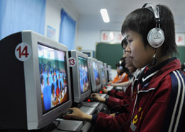 6月11日,學(xué)生們在使用遠程教育系統(tǒng)聽外地教師講課。